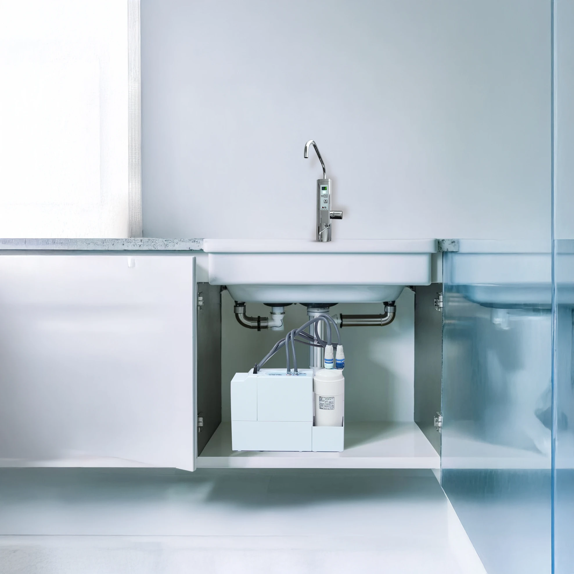 Sở hữu thiết kế âm bồn (undersink) tinh gọn, toàn bộ thân máy được lắp đặt kín đáo dưới tủ bếp. Chỉ có vòi nước nhỏ gọn, sang trọng hiện diện trên chậu rửa, giúp tối ưu không gian và nâng tầm đẳng cấp cho gian bếp hiện đại.